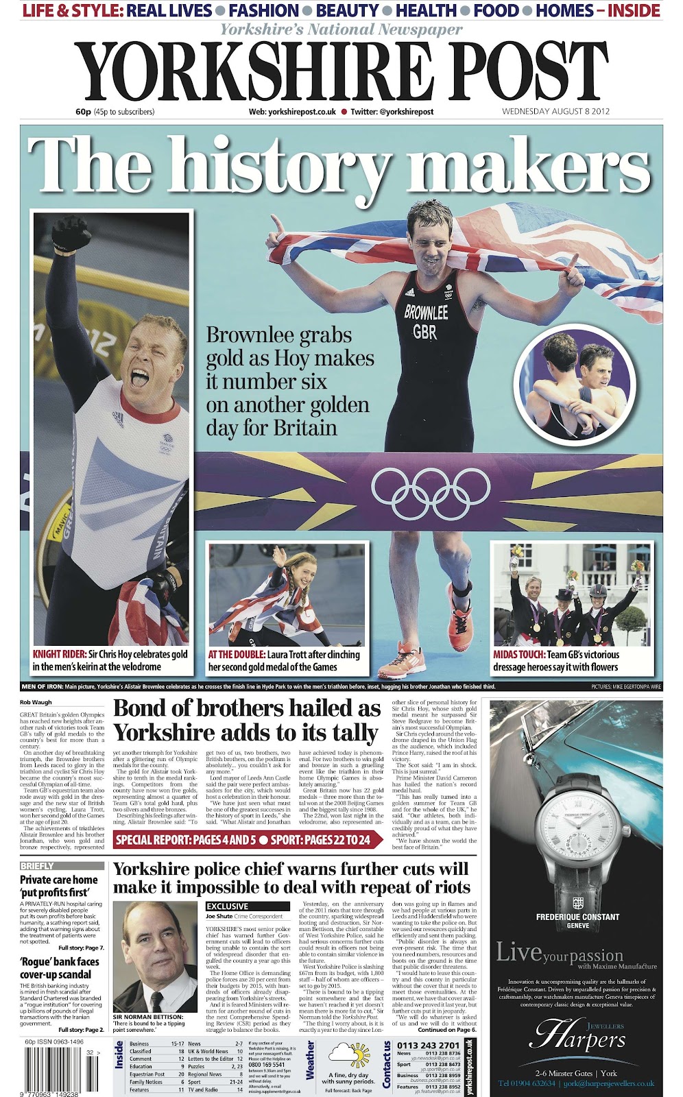 The Yorkshire Post and Evening Post celebrate Alistair Brownlee making history by winning Great Britain's 19th Gold medal and his brother Jonathan getting a bronze